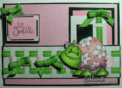 I love turtles, especially one Franklin, I used to read his stories to my sons. I still have all the books and the stuff toy.I bought this cutie when I followed my first Copic workshop, she is called Floral Turtle from Whipper Snapper Designs and she was the first stamp I ever colored! For this card, I started to color with Copics, added rhinestones, glued glitters and finally covered the flowers with Doodlebug velvet flock. What do you think about this, for someone who did not want to get into this business? I punched slits on the white cardstock, and criss-crossed ribbon all through. Of course, I had to add little bows...